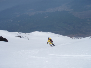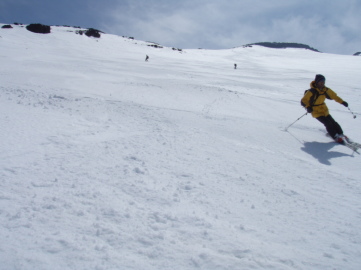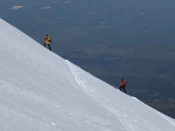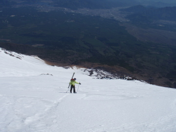 | 今日は時間が無いので最高峰の剣ヶ峰はパス。 吉田大沢へのドロップポイントである白山岳手前の鞍部を偵察しにいくとしっかり雪が繋がっていた。 しばらくしてお気楽さんが登ってきた。 どうやらまっちゃんはアイゼン歩行に慣れてないので本八合目で断念したらしい。 たしかにあの付近は風が強かったので無理は禁物だ。 運よく携帯電話が繋がったので本八合目にいるまっちゃんに吉田大沢の途中で合流するべく打ち合わせをする。 そうこうしてる内にきむひろさんが到着したのでドロップ地点にみんなで移動し滑降準備に移った。 時間は12時半くらい、雪質はいい感じに変わっている。今がチャンスだ♪ まずはお気楽さんから吉田大沢に滑り出し、あっという間に姿が小さくなる。気持ちよさそうだあ〜☆ 続いて僕もドロップ。鞍部から少し滑ると一気に斜面が左右に広がる。これが吉田大沢の一枚バーン。すごいスケール!! 30〜35度くらいの斜面が延々続いていく。河口湖や山中湖を遥か下に見ながらしあわせ気分で滑り降りる。 夏道方面にトラバースしながらまっちゃんを探していくと下の方で手を振ってる人影を発見。 そちらに滑り降りると案の定まっちゃんだった。無事合流するとあとはそれぞれが好きなようにシュプールを描きながら滑り降りる。 五合目まで戻るのになるべき歩きを減らすため途中から左方向にトラバースしながら滑る。 途中3回ほど雪の切れているところを板をはずして10mほど歩いたが最後は五合目のすぐ近くまで滑り降りることが出来た。 五合目まで戻ると観光客がいっぱい。スキーを担いでいる僕たちはかなり浮いている。 クルマに戻りさっさと後片付けして観光客に混じりながらソフトクリームで打ち上げ☆ 今シーズンはこれにて終了。最高な気分で締めることが出来ました。同行のみなさま感謝です。 |
