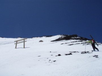 | 今シーズンのラストスキーもやっぱり富士山! 昨年は富士宮からだったので今回は反対の吉田大沢に照準を合わせる。 なんせこの山は天候に左右されるので土曜と日曜のお天気がいい方に登ることにして計画をたてる。 前日の天気予報では土曜日の方に分がありそうなので富士ビジターセンターに4時半集合ってことで現地に向かった。 大阪を夜の10時に出発し高速を飛ばして富士ビジターセンターに着いてみると夜間は駐車場閉鎖になっていた(;◇;) とりあえずそこから10分くらいの距離にある道の駅「かつやま」に移動し集合場所変更の連絡をみなに送る。 それでもだいたい予定通りの時間に全員集合、通行料対策でクルマを2台に整理してスバルラインの五合目を目指す。 空は快晴。目の前に富士山がどか〜んと見えている。 何度見てもそのスケール感には圧倒される。 計画ではクラスト対策のため6時歩き出しで頂上まで到達しなくても12時〜1時の間に滑降開始! さて、がんばって頂上を目指そう。五合目駐車場を出発しお土産屋さん群を通り過ぎるとすぐに通行止めの柵がある。 ここは柵の横の隙間から通り抜けて六合目を目指す。このあたりからすでに雪が出てくる。定説通り暖冬の年は富士山の雪が豊富だ。 30分ほどで六合目に到着。ここから頂上までは各自バラバラで登ることにする。 富士登山は自分との戦いの要素が強いので、それぞれのペースで登るのがベストだ。まあ修行みたいなもんだ。 最終集合時間の打ち合わせをしてバラバラに登りはじめる。 しばらく夏道通りつづら折れに登って行くと七合目の小屋群に到着。このあたりから雪の上を歩くようになる。 つぼ足でステップをきりながら夏道をショートカットし直登していくがだんだん雪が固くなってきたのでアイゼンを着ける。 右手には広大な吉田大沢の斜面が見えている。 八合目最初の小屋である太子館まで登ると徐々に風が出てきた。 クラスト斜面にアイゼンがよく効いている。 ときおりふく強風に立ち止まりながらも確実に高度を上げていく。本八合目に着くと頂上が見えてくる。 見えていても富士山はここからが長い。 睡眠不足と酸素不足でどんどんペースが遅くなる。 後ろを歩いていたかっきーがへろへろペースに痺れを切らしてどんどん先にいってしまった(;◇;) このあたりになると息が苦しく10歩以上連続で歩けない。 九合目の鳥居を過ぎ、目指す頂上はすぐそこに見えているのにぜんぜん近づいてこない(>◇<) 先に登りきったかっきーが手を振っている。結局最後までへろへろペースだったが無事に吉田口頂上(3710m)に到着。 お釜をはさんで反対側に最高峰が見えている。頂上は比較的風が弱くのんびりとした気分で後続を待つ。 |