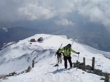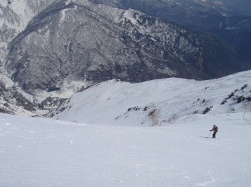 | 白馬の週末2日目はお手軽にガラガラ沢に行く事になった。 今日もクルマを一台二股にデポ。 もう1台で八方に移動しゴンドラに乗り込む。 ゲレンデ上部でリフトを2台乗り継ぎ八方池山荘に到着。今日も他力本願成就(-人-) さてさて、ポカポカ陽気の中をツボ足で軽快に出発。 広大な八方尾根の景色を楽しみながらのんびり歩く。 あまり早く滑り出して雪面がクラストだと楽しめないので滑降開始を10時に設定する。 それでも八方池に9時半には到着。パンをかじりながら景色を楽しむ。 しあわせタイム〜(・◇・)♪ 10時になったのでそろそろ滑降開始。まずは八方池からガラガラ沢の方向にドロップ。 ややクラストしてる箇所もあるが緩むのも時間の問題か。。 八方山の斜面をトラバース気味にガラガラ沢に入ると遥か下に南股入の景色が目に飛び込む。 雪面は最高のザラメ♪ ぎゃお〜と叫びながらガラガラ沢に滑り込んでいく。 シアワセな時間はあっという間に終了。高度を下げると雪はぐしゃぐしゃの腐れ雪に。 南股入の右岸をトラバースしながら下流に滑っていく。堰堤の手前で渡渉。左岸に渡り板を担いだまま林道に出る。 林道では200mほど滑れたがあとは完全に雪はとけていた。 しかし二股まではそう遠くない。 お手軽お気軽な楽しい半日でした。 ご同行のみなさまありがとう☆ |