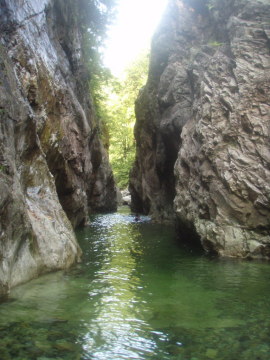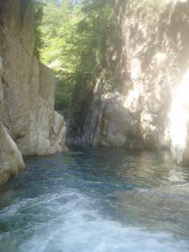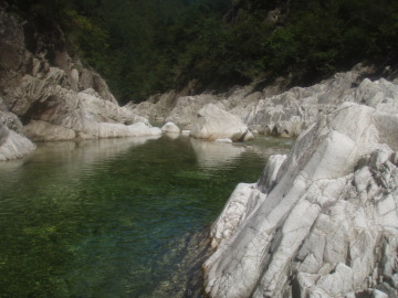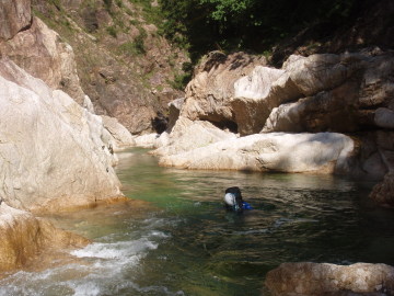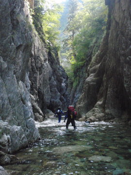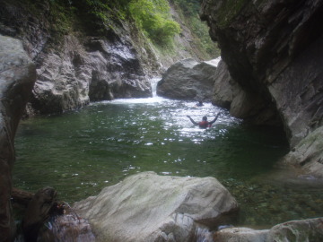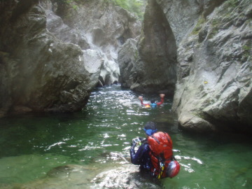 | 翌朝は5時に起床。ゆうべは疲労と食ってすぐに寝たからか朝から胃の具合が絶不調。 ミルクティーだけの朝食にしておく。ド変態けもにゅで各氏は朝から獰猛な食欲で3人前を一瞬で平らげていた。 ああ、わたしはあなた達のようになりたい。 今日は登れば難関、雨降れば地獄の早出川中流部を下降するので完全水泳スタイルに身を固める。 7時過ぎに体調不良の中を歩きだす。今出を出るとすぐに最初のアトラクションのコスゲ淵に到着。 今早出沢と割岩沢が合わさってるのでやはり昨日までに比べて水量は断然多い。 わたしは水泳スタイルなのでそのまま淵に滑り込んでプカプカと進んでいく。ライフジャケットしあわせ。 もと水泳部のにゅで氏も得意のラッコ泳ぎでなんなくクリア。あとはかなづちのけも氏のうめき声だけが聞こえてくる。 いつまでたってもこないのでにゅで氏が泳ぎもどってけも氏を引っ張って来る。これでにゅで氏の体力は尽きたようだ。 泳げないのにようこんなん計画しますなあ〜 まあド変態やから仕方なし。 その後、河原を歩いていると下流から釣りながら遡行してくるパーティとすれ違う。 対岸だったのでお話はできなかったがダムから来られたならば敬意を表しまする。 すぐに左から広倉沢が出合う。てことはこの次に出てくるのが大釜淵かあ。 どんなところだろ♪ 水泳スタイルのわたしは楽しみだがあとの二人はすでにぐったり。 言うてる間に両岸が狭まり水路が奥に続いていく。 これが大釜淵なりか! 中に滝が無いことは情報として分かってるので何を躊躇することもなく流される。 ライフジャケットさまさまで流されていく。 細い通路から流れ出ると大釜。ゆったりと流れる。 そのまま再び淵に続きゆうゆうと泳ぎ下る。で、またまた釜? なるほどこれは登るのは大変だわ。 泳ぎ疲れたあとにあの水路が待ってるねんもんねえ〜 下降はらくちんなりよ。 で、あとのラッコ2匹もヒーヒー言いながら抜けて出てきた。 にゅで氏は寒い寒いと言うてはる。そりゃカッパの上だけじゃ寒いでしょう〜 で、へつりや河原歩きと少しの泳ぎをまじえながら下って行くと20分ほどで左から清水沢が入る。 まだまだ先は長い、どんどん進もう。 すぐに右から容ヶ谷。 沢と谷の使い分けは何なんだろう?? しばらくで左からヨシノ沢が入るといよいよ次のアトラクションであるコモリ淵の領域に近づく。 言うてる間に両岸が立って淵が続くようになる。一直線に続く淵を泳ぐ。 いやあ泳いだ泳いだ。にゅでけも両氏は勘弁してくれってな感じで抜けてきた。左からコモリ沢が入るのを確認。 支流がいっぱい入るので増水も早いのね。おまけに源流は保水しない大スラブ壁やし。 右からヤハズ沢がトユ状の滝で入って来ると本流は再び両岸3mほどに狭まり水路状になる。 すぐに抜け出て明るいゴルジュに変わる。白い岩肌がまぶしい。 なかなか気持のよい場所だ。 太陽の光を浴びてランチタイム。寒いにゅで氏はやっとカッパの下も履いたのでやや復活か。 右からトウガン沢がナメ滝で入る。このあたりは明るい渓相が続いていく。 30分ほどで強清水沢が入るといよいよお次のアトラクションであるシゴヤが始まる。 まだ11時前なのに泳ぐのもだいぶお腹いっぱいになってきた。。 両岸が狭まり長い淵が続く。ヒーヒー言いながら泳いで抜け出る。 20分ほど進み右からゼンマイ沢が入るあたりは白い岩の広々としたゴルジュだ。 しかし荷物も水を吸いまくって重い〜 だんだん疲れてきた。 左から上マサワリ沢が滝で入る。しばらく進み右からミン沢も滝で入る。ここで12時10分 本流は屈曲しながら流れて行く。丸山沢?地形図上はワリ沢?が右から入る。 40分ほどで左から下マサワリ沢が滝で入るが、もう疲れてきてどうでも良くなる。 似たような景色が続くので現在地は地形図とコンパスで谷の向いてる方角で適当に同定する。 13時半くらいに右からボフ沢(地形図上水線のある沢)が滝で入る。いよいよ最終段階に突入か。 両岸が立ってきて淵が続くようになる。頑張って泳ぐのだ自分。 右からガレのような六三郎沢が入るといよいよハヨ止まりに突入。泳ぎ出る頃には14時を回っていた。 谷が屈曲するあたりでカクマ沢と丸子沢が入り、本来なら次のドウゾ淵の手前で踏み跡で谷から抜け出るはずだった。 しかし勢いでドウゾ淵も泳ぎ越えてしまった。左から中杉川が出合ところで我に返る。 「行き過ぎたようね」「そのようね・・」 時刻は14時40分。もうドウゾ淵を泳ぎ戻る気もない。 右岸を適当に登れば湖岸道に戻るゼンマイ道が横切るはずやろうってことで適当に斜面を登り始める。 ここで今までの快適水泳グッズが単なると重しとなり他の2名と形勢逆転。もうへろへろ。勘弁してくれ〜 急斜面をモンキークライムで登って行く。薄い踏み跡に出るがけもけも道かどうか判別つかん。 どんどん登って行くとやっと本来の踏み跡が横切った。これがまた藪が被った道で路肩を踏み外さんよ