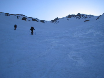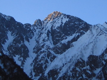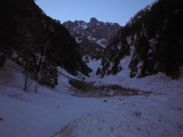 | デブリの押し出した滝谷を薄暗い中通過 | 涸沢岳に日があたる! 今日の晴天は確実♪ |