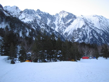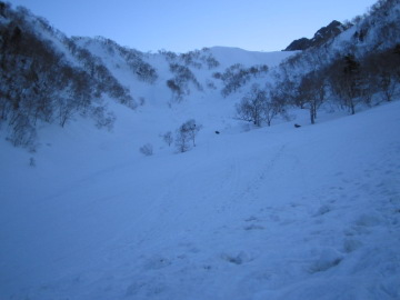 | 清清しい槍平の朝 | ここを回り込めば飛騨沢の大斜面が見えるはず♪ |