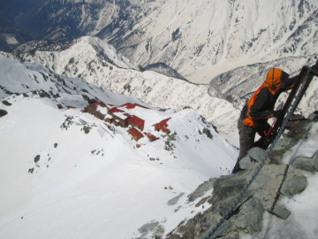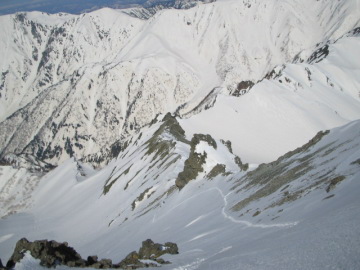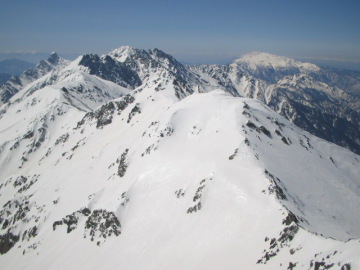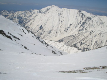 | 大槍の登りは渋滞というほどのものはなくすんなり槍ヶ岳山頂(3180m)に到着。 ここのてっぺんからの景色はいつ見ても素晴らしい♪ 大満足で槍の肩に戻る。 槍岳山荘のテラスでランチタイム。 おにぎりが美味しい! 極楽極楽(^−^)♪ さてまだ11時にもなってないがこれだけ太陽があたると雪も緩んでるだろうってことで滑降することに。 飛騨乗越までは板は担いで下る。 いよいよ目的の飛騨沢滑降♪ うれしいなあ☆ 出だしはまだクラスト気味なので慎重に滑りだす。 まさに正面の笠ヶ岳に飛び込んでいく気分だ。 少し斜度が出るが標高が下がると雪もいい感じに緩みだして快適に滑っていく。 飛騨沢を登ってくる人がみんな注目してるのでここでコケる訳にはいかない(^−^; あっという間に槍平まで滑り降りた。 まさに登り3時間、下り30分の世界だ(T◇T) このあたりまで標高を下げると今日の日差しは暑い暑い。 さっさと滑って風を感じよう♪ 滝谷手前は融雪していて、いつ押し出してくるかわかんないのでなんとなく薄気味悪い。 素早く通過通過。 白出沢の手前で登山道に復帰しようとツボ足で斜面を上りだすがズボズボ沈んで一向に進まない(><) 今回ここが一番疲れたかも。。 次回はもう少し考えてコース取りしないと・・ 白出沢を過ぎると、残雪を拾いながら林道クルージング。 観光客でいっぱいの新穂高温泉に無事到着♪ 今日も楽しい1日でした!! |