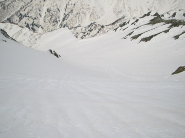 | やって来ました2006年のGW!! しかし・・・ 後半初日仕事です(>◇<) と、なると友達とも合流できず完全に出遅れました。 各地から とりあえず日帰り可能で満足できそうなコースを探してみる・・・ ありました♪ 飛騨沢!! ではいってみよう〜 単独はお気軽なのです☆ 新穂高温泉の登山者用駐車場に1時半ころ到着。 空にはこれでもかっと言うくらいの満天の星☆ シーンとした駐車場で静かに出発準備をする。 草木も眠る時間、仮眠してる人は多そうだが出発準備してるのは僕だけ^−^; バスターミナルに移動しお手洗いを済ませ登山届けをポスティング。 時刻は2時15分真っ暗な中を歩き出す。 車止めゲートを過ぎるあたりからは雪が続くようになった。 シール登行にするか考えるが雪は締まっているのでそのままツボ足で進む。 今夜はヘッデンの明かり頼りの真っ暗な夜だが、単調な林道歩きなのでまったく問題なし。 白出沢のところで先行者のヘッデンの明かりを発見!! お話を伺うと今から白出沢を上がられるとのこと。そのあとは涸沢に滑り込んで槍に登り返し!! それを日帰りっ!! すごいです!!! 後日四季彩光の管理人さんだと判明しました。 白出沢には大きなデブリが出ていた。 対岸に渡り細い山道になる。 しばらく進んで適当なところから河原に降りる。 ここからスキーを履いてシール登行に切り替える。 このあたりは水流が出ているので端っこを進んでいく。 しばらく順調に進むがチビ谷からは猛烈なデブリが押し出していた。 カチカチのデブリ帯をシールで乗越えようとしたがすべって転がる。 いたたた・・・(><) あきらめて再び板を担ぎツボ足で歩き出す。 滝谷あたりまでくると完全に水流は雪の下に。 デブリの押し出した滝谷をすぎると谷は一瞬狭まる。 ここらは両岸からのデブリだらけ。 条件の悪い時は通過したくない場所だ。 どんどん登っていくと広々とした地形になる。槍平に到着したようだ。 振り返ると涸沢岳に朝日があたり輝いている。 いよいよ夜明けだ。GWという事もあり槍平にはたくさんのテントが張っていてそろそろ出発の準備にかかってはる。 ここで穂高連峰を見ながら朝食タイムにする。 素敵な景色を見ながら食べるおにぎりは格別だなあ♪ さていよいよここから本格的な登りになる。 スキー板は重いけどこのままツボ足で行く事に。 徐々に傾斜が増してくるがどんどん登っていく。 大喰岳西尾根を回り込むようにカーブを切ると目的の飛騨沢大斜面が!! その奥に飛騨乗越が見えてるがまだまだ遠い〜(>◇<) このまま飛騨乗越まで登っても単調なので西鎌尾根から登ろうと左の斜面に取り付く。 稜線まで上がるとすばらしい景色だ。 しかしちょっと取り付いた場所が早すぎてここはまだ中崎尾根の途中。 千丈沢乗越までの急斜面をFIXロープとハイマツに助けられてヒーヒー登る。 兼用靴と岩場の相性はさいあくだあ\(・◇・)/ 出発前どうも太ももが張り気味だったのがここで爆発(>◇<) 足攣りまくり。あう〜 千丈沢乗越を過ぎたあたりで第二朝食タイム。 素敵な景色を見ながら食べるパンとコーヒー牛乳は格別だなあ♪ この先は雪の斜面が続くのでアイゼンを装着。 つらい登りだが一歩ずつ背後の景色が広がっていく。 急斜面を登りきり岩を回り込むととつぜん目の前に槍ヶ岳の穂先が現れた♪ 槍の肩はGWだがいまのところそれほど混雑はしていない。 槍沢をのぞいて見ると蟻の行列のようにどんどん登ってきてはる。 今のうちに大槍にいっとかんと大渋滞すると思いザックを置いてすぐに山頂へ。 |