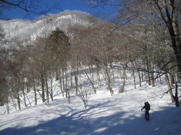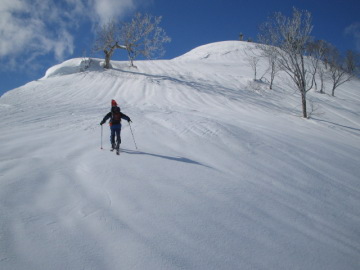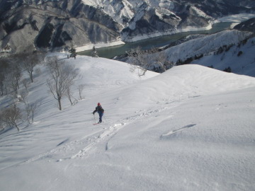 | obaさんが奥美濃方面に行くとの情報を得て便乗させていただくことになった♪ 今回初めてご一緒するBAKUさんといるかさんにお会いするのも楽しみ♪ 結局場所は良質のパウダーを求めて奥美濃よりまだ北の飛騨高地に位置する御前岳前衛峰に決まった。 しかし週末の降雪予報がみごとにハズレてパウダーの可能性がゼロ^−^; パウダー無くしては面白にかける御前岳方面はやめて手軽にピークハント出来る日照岳に変更。 7時ころに国道156号御母衣湖畔にある日照岳取付きに到着。 トンネル手前の少し路肩スペースのあるところに駐車し、準備をしてさっそく出発。 先週の大雨以来大した降雪がないのか雪面はカリカリで先が思いやられる。 いきなり急登が始まった。ヒーヒー言いながらジグザグに高度をあげていく。 obaさんはもちろんのことBAKUさんもいるかさんも慣れたものでラクラク登っている。 僕は相変わらずトラバースが苦手でカリカリの斜面で滑り落ちそうになるたび冷や汗がたらり・・(^−^; それでもなんとか無事に1160mピークに到着。 朝のうちは快晴のようでとても気持ちがいい。。 振り返れば御母衣湖が見下ろせる。 まあ今日は景色を楽しめたらいいか・・ 途中いったん傾斜が緩くなる場所もあるが1534mピークまでは急登が続く。 相変わらず雪質はカリカリで滑りはまったく期待できないよう。 カリカリの急登もクトーを付けてなんとかマトモに登れるようになった。 1534mピークまで登るといよいよ日照岳が見えてきた。 あともう少し。 ちょうど先行していたボーダーのパーティが頂上に到着しようとしているところのようだ。 行動食を食べながら少し休憩。 さてさてあとは傾斜も落ち着いて頂上を目指すだけ。 尾根がいくぶん痩せてくる。 稜線の左手には雪庇が張り出してるので注意しながら進む。 このあたりで先行していたボーダー3名とすれ違う。 僕も早く滑りたいぞ! |