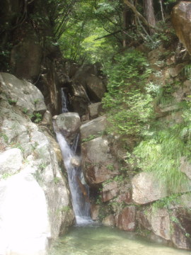 | 今週はMATさん夫妻との沢登り。 計画はMATさんにおまかせにしていたつもりがMATさんも僕になげていたつもりだったようだ。 てなわけで、前日に何も決まっていないことが発覚。 あわてていろいろと考えるがお天気も何やら流動的で最終的にはお手軽な鈴鹿の東多古知谷になった。 前夜、雨の名阪国道を東に走り、鈴鹿スカイラインの休憩所で仮眠する。 翌朝、目が覚めるとお天気は晴れ。梅雨時の天気はよくわからんです。 今日は短い沢らしいのでぐだぐだと準備してだらだらと出発する。 鈴鹿スカイラインを少し走ると昨年の土砂災害でえらい手前で通行止めになっていた。 しかたがないのでいったん戻り、湯の山温泉から奥に入り中道登山口付近の駐車場を目指す。 しかし出遅れているのでさすがに駐車場は満車だった。少し戻った空きスペースにクルマを止める。 すでに気温は高いが、東多古知谷は水量も少なく納涼ってな感じではなさそうな・・・ ゆうべの雨で水量が増えていればいいが・・・ まずは武平峠に向かう登山道を登っていく。すでに暑さでヒーヒー言うしまつ。ぱおぱお教はまだ半分寝ながら歩いてるし。 ダムの堰堤を越えてすぐに東多古知谷を渡り表道の登山口に到着。石の鳥居などがあって雰囲気のある場所だ。 表道に入ってすぐに鈴鹿スカイラインをくぐる。谷には堰堤がありその上から入渓。 堰堤の上からはすぐに廊下状の連瀑がはじまっている。 最初の4m滝は左壁から登る。続く4m滝は右手の岩間から上がる。 谷中にはまだ新しく堆積したような岩がごろごろしているが、昨年の豪雨時のものだろうか?? 初めての沢なので良くわからない。 廊下の突き当たりは行きどまりのルンゼで谷は右に曲がり20m滝を架けている。 ここはスリップに注意しながらシャワークライミングで快適に登れる。 ぱおぱお教はまだ寝ながら歩いてるので念のためお助けロープでひっぱりあげた。 登ってる途中のシャワーで眠りから覚めたらしく、「鶴亀鶴亀・・」と唱えながら登ってくる。 以後、核心では鶴亀鶴亀と念じるのがぱおぱお教のお題目になった。 20m滝の上にあがると本日の目玉である百間滝70mが登場。下からではほんとに70mあるかわからん。 なかなかの見ごたえがある滝だが水量が少ないのが残念。 高巻きに備えて滝下でシャワーを浴びてクールダウン。 水を浴びると気持ちいいのだが、上部は観光地化されてるので飲料不可の水というのがなんだかなあ。 さてさて、巻きは右手にずっとトラバースしていき小尾根のところから登ると簡単に滝上に行けた。 落ち口から上は気持のよいナメ床で振り返れば鎌ヶ岳の雄姿が聳えている。 ここで景色を見ながら休憩。パンをかじりながらのんびりまったり。なんてったって先は短い。 しばらくナメが続くのだが、どんどん土砂の堆積がひどくなる。 しまいには谷が土砂で埋まってる状態が続く。これも昨年の豪雨の影響かな? 最近の堆積らしく浮いてる岩も多い。 つぎに出てきた顕著な滝は12m滝で登れそうもない。 いったん右手に入るルンゼを登っていき、適当なところでトラバースし川床へ復帰。 |