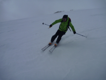 | 外輪の上は風が強いので一段降りたところで滑降の準備をすることにします。 馬の背の分岐まで外輪を歩いてから50mほど下ると、風が緩くなりました。 のんびりランチを食べてから滑り始めます。 最初はまずまずの雪質です。 かっきーと一緒にごきげんに滑り降りていきます。 双子山(二ツ塚)のピークハントもしようと話してましたが、宝永山の斜面から見下ろす双子山(二ツ塚)が、 あまりにしょぼいので素通りすることにします。 楽しかった滑りも、高度を下げるとどんどん雪が悪くなって修行系になってきました。 我慢の滑りが続きますが、景色が良いので気分も爽快です。 あっという間に御殿場口まで戻ってきました。 最後は、樹林帯の中を往きのトレースに沿って滑り降ります。 太郎坊まで戻って本日の行程は終了。 さすが日本一の山です。斜面の雄大さはさすがの一言です。 かっきー、楽しい1日をありがとうございました。 |