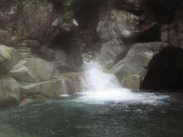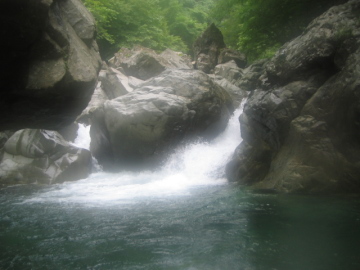 | 兵衛谷に入ってしばらく単調なゴーロがつづく。 30分ほど歩くと右手に2段の滝を見て、その後谷が狭まってくる。 最初に出てきた淵を泳いで滝を越えると、今度は流木が重なった淵が・・・^-^; 木と木の間をすり抜けてから淵を泳いで次の滝は左手から越えた。 また泳いで正面を見ると谷は左に折れていて立派な滝が落ちている。曲滝20mのようだ。 さすがに名前がついてるだけあって立派だ。 ここは少し戻り、右岸から高巻く。 次に出てくるゴルジュはちょっといやらしかった。釜をもった3m滝を越えて次に出てきたのは2m滝。 ここは右手のつるつるの岩をあやしげなFIXロープを手がかりにテラスに上がった。 支点を確認すると、なんとか持ちそうな感じなので、そのままFIXロープを使って今度は滝上に下降した。 あとから来るパーティのためFIXロープはちゃんと下流側に戻しておく。 ゴルジュを抜けると次に2条3m滝。そして再びゴルジュに突入。 暗い淵を泳いで越えると再び淵が・・ 再び泳いで越えるとまたもや淵が続く。 このあたりはとても谷幅が狭い。 雨も本格的に降り出してとても寒いが次から次と淵が出てきて泳がされる(T◇T) 二人で「また淵やあ〜」「もうかんべんしてくれ〜」と泣き言をいいまくる。 やっと淵から解放されてトユ状の滝を越えると20m滝が立ち塞がったので左岸から巻く。 高巻き途中に岩のトンネルが出てきて胎内くぐり好きのかっきーは大喜び^-^ 谷に戻ると穏やかな河原状になっておりこのあたりで本日は遡行終了とする。 さすがに雨に湿った流木はなかなか火がつかず、寂しい夜になりそう。睡眠不足も手伝って陽も明るいうちに寝ることにした。 明日も長い行程になりそうなので「6時には出発したいなあ〜」 っと打ち合わせのあと就寝。 |