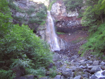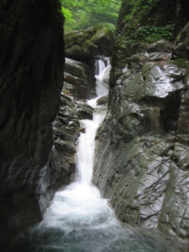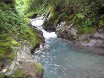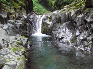 | 翌朝陽の明るさで目が覚める。 あわてて時計を見ると予定通り寝坊(><) バタバタ用意して7時20分に出発。 相変わらず変わった形状の壁を持った淵が続く。 すると目の前に変わった滝が・・・ 水流は釜に落ちてるが出口がない。。(^-^? 溶岩質の山はいろいろ楽しい景観を作るもんだ。 ここは滝右手を登って落ち口へ。 そこから5分ほどで取水堰堤が現れる。 堰堤を左岸から巻いて越えると、水量が一気に増えた^-^; これが、兵衛谷本来の水量かあ・・・ ここで先に出発されてた昨日の3人パーティに追いついた。 しばらく進むと釣り師が2名竿を振っていた。 取水堰堤から入ってきたらしい。釣果を聞くとイワナが1匹だけと恥ずかしそう。 昨日のゴルジュ帯ではけっこう魚影が走るのを見たが、人が入りやすい場所は少なくなってるのかな。。 素晴らしいナメ床が続いているが、水量が多いので優雅さがない。。 右手に石楠花沢が入り、その後もナメや釜を持った小滝がつづく。 すると前方に爆音と共にすごい水量の直瀑20mが現れた!! えらい迫力だ^-^; ここは右岸から巻いて滝上へ。 20m滝の上もナメ床が続いていて、とても美しい景色が続いていく。 |