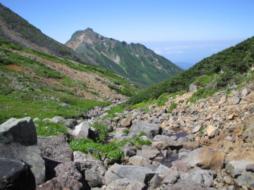 | 源流帯 賽の河原は近い | 三の池を望む 後方遠く乗鞍岳も見えていた |