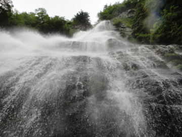 この滝は裏見の滝でもあるのでの滝の裏側に回りこんでみる。50m上空から落ちて来るシャワーが気持ちいい♪