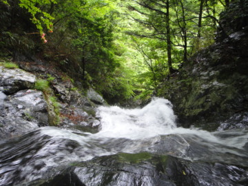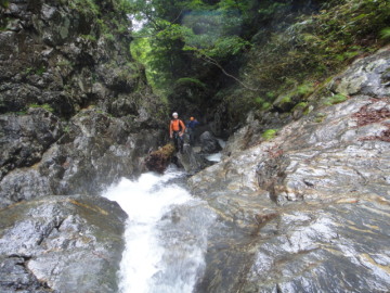 まずは5m滝を滝身の右から簡単に登る。おつぎの3m滝を越えると目の前に岩壁に囲まれた