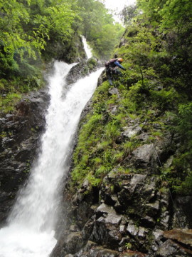 2条V字10m滝が登場。ここは安全策で滝の右壁をロープを出して登ることにする。