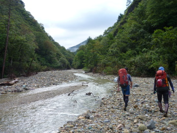 | 9/25 金蔵谷出合(7:20)---ヘノ沢出合(9:00)---ロンレ沢出合(10:10)---稜線(12:15)---ヤオトメ沢出合(14:50)---大江大橋(15:00) |