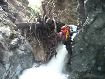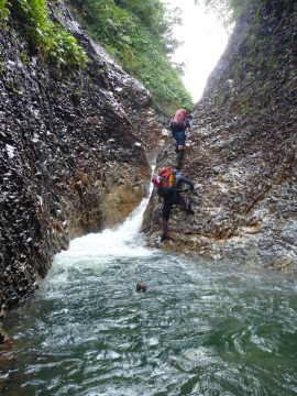 | 3段30m滝は右壁から登る | 中段滝上で左壁に移動 |
