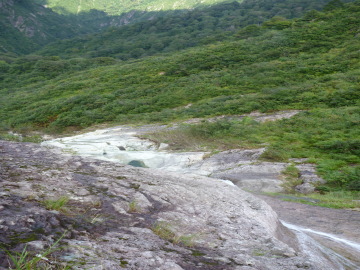 | しばらくは河原歩き | 磨かれた白い岩の美しい渓谷 |