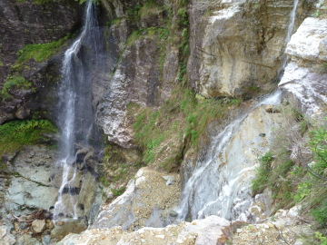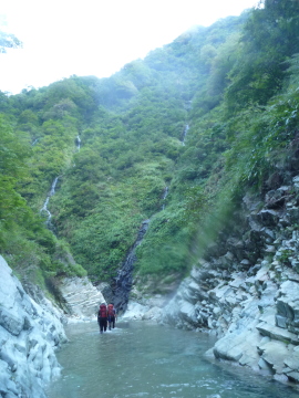 | 右俣と左俣は大滝で出合う | 川床に戻った地点 奥に大滝が見える |