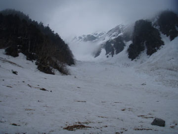 | 2年前から計画しては天候不良などで諦めてきた涸沢スキーをまたまた懲りずに計画。 今回は晴れの予報でなんとかなりそう。 目的は奥穂直登ルンゼと北穂沢だ。 同行者を募るがみな「今週は富士山に行くのだ!」とか「猫の世話するのだ!」とか言うので結局ひとりで行くことになる。 仕事を終えてからクルマを飛ばして新穂高登山者無料駐車場に着いたのが午前2時半。すぐに準備して出発。 新穂高バスターミナルで計画書を提出。蒲田川右俣林道を歩いていく。 さすがに残雪はほとんど見当たらない。白出沢手前でようやく少しの雪を見る。 白出小屋から奥穂高岳への登山道に入る。登山道はところどころ残雪があり一度迷う。 空はだんだん薄明るくなってきたが穂高方面はガスの中だ。 西穂沢を右に分けたあたりで登山道は白出沢の左岸を行くようになる。 しばらく進むと白出沢が雪渓で埋まったので雪の上を歩いていく。曇り空なので放射冷却もなく、早くも雪は緩み気味だ。 天狗沢出合付近でテントがひと張りあった。白出大滝の巻き道は右岸から。雪に埋もれた登山道を急登していく。 途中で道に迷って登りすぎてしまい戻ったりして30分ほどロスタイム。 巻き終えたところは荷継沢出合。正面には白出沢が傾斜を強めながら真っ直ぐ伸びている。 つぼ足でどんどん登っていくと新雪が出てくる。数日前に結構な量の雪が積もってるようだ。 一度膝までずぼっともぐった拍子に左モモが攣ってしまう。 しばらく足が硬直して曲がらない。オーバーズボンのサイドファスナーを全開で歩いていたので冷えてしまったようだ。 しばらく休憩しているとなんとか歩けるまで復活。つぼ足だと潜るのでここからはシール歩行に切り替える。 振り返ると後方に単独行の登山者が見える。白出のコルまでは誰にも会わんと思ってたがこの道を登る人もいてるもんだ。 前方はるか上に穂高岳山荘が見えてるがなかなか近づかない。雲の動きが早い、稜線は風が強そうだ。 白出のコルに近づくとクラストしてくるがクトーを効かせながらそのまま登りきる。 涸沢岳の肩あたりから涸沢に滑り込むパーティを見ながらしばし休憩。 今回の目的のひとつが直登ルンゼを滑ること。 白出沢のクラストを見て今日は無理かなと思っていたが涸沢側を覗くと太陽があたって暖かそうだ。 無理なら登山道を戻ったらいいしとりあえず板を担いで奥穂高岳に向かう。 白出のコルからハシゴをふたつ登りその上の雪壁を慎重に登る。 睡眠不足で足取りはへろへろだ。これで直登ルンゼ滑れるのだろうか。 稜線上はガスが流れている。ガスの晴れ間に山頂の祠が見えてきた。 祠のすぐ横が直登ルンゼの滑降開始地点だ。さすがに急斜面に見えるなあ。 雪壁を登るとすぐに奥穂高岳(3190m)のてっぺんに到着。 山頂には先行者が一人。後ほど涸沢で再会するOさんが景色を楽しんでられた。 僕はとにもかくにも直登ルンゼを覗き込む。祠の横からトラバースするあたりはサクサクの雪質だ。 でもトラバース後のルンゼ最上部あたりがなんだか怪しげに見えるなあ。 ルンゼの真上に行って観察するがようわからん。でもなんとか行けそうな気もする。 Oさんは涸沢での再会を約して先に登山道を白出のコルに降りていった。 さて、山頂にひとりぼっち。直登ルンゼ名物?のギャラリーもいないが滑り出すことにしよう。 イメージではトラバースしてワンターンで一気に斜面が広がるところまで滑り込む予定。いざ、ドロップ! 祠の横から急斜面をトラバースしルンゼ最上部に移動するとガリガリと嫌な感触が。 クラストしてるやん(;◇;) ターン出来ずに停止。 足元は45度の斜面が滑り台となって続いている。 う〜ん。我ながらこんな場所で身動き出来なくなってる自分が滑稽に見える。 仕方がないので不本意ながら横滑りでガリガリガリガリと10mほど滑り降りる。ギャラリーいなくて良かった。 ルンゼが広がるあたりでとりあえずワンターン。うまくいったのであとは連続ターンで高度を下げる。 高度が下がると雪質が緩んできて気持ちいい♪ ノドあたりで再び傾斜が強まる。自分で起こす雪崩に気をつけながら一気に通過。どでかい涸沢カールに入り込む。 今度は数日前の新雪がグザグサになって滑りにくいったらありゃしない。 斜面を切って雪崩を起こさないように慎重に滑る。下に登山者のいないところまで移動し涸沢ヒュッテ目指して滑り降りる。 グサグサの雪がひかっかって仕方がない。疲れた足にはとても堪える。まさに修行のようなすべりだ。 この雪ではもう一本滑るって気にもならずそのまま宿泊手続きをして小屋でのんびりすることにする。 久しぶりの山小屋なのでうれしい。部屋も6人部屋を3人だけだったので快適だ。 先ほどのOさんとも再会出来、雪の涸沢を見に来た人や一人で滑りに来た人、蝶ヶ岳に登るついでに寄った人!などなど。 みな気ままな単独行の人たちとカールの景色を眺めながら楽しいひとときを過ごせた。 |