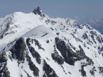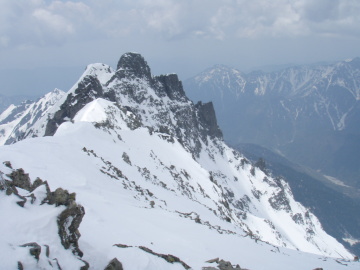 | 奥穂高岳と昨日滑った直登ルンゼ | 北穂沢滑降開始♪ |