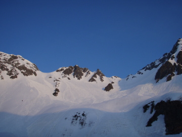 | 翌朝は朝から快晴。4時に目が覚めてすぐに外に景色を見に行く。穂高の岩壁に朝日が当たってとても綺麗だ。 昨日の雪質に心は萎えていたがこの天気で帰るだけはもったいないので最初の計画通り北穂沢に行くことにする。 滑りは楽しめなくてもピークハントだけでも満足できそうな気分。 朝食を食べてすぐに出発。まだまだ気温が低いのでつぼ足アイゼンで登る。涸沢小屋の横から北穂沢の急登に入る。 この登りもなかなかキツイ。ヨレヨレと一歩一歩登っていく。 1時間も登ると気温もあがり雪が緩んでくるのがわかる。ちょっと早すぎやあ〜 早く滑り出したいが足が重くてペースがあがらん。先行していたOさんが北穂高岳のピークを踏んで降りこられた。 「もうすぐ頂上」との言葉に元気をもらい、ヘロヘロになりながら北穂高岳北峰のてっぺんに到着。 頂上からは槍ヶ岳がきれいに見える。定番の景色だ。 のんびりしたいところだが時間が経つと雪質が悪くなるのですぐに滑ることに。 頂上からは雪が切れているので南峰とのコルまで降りてから滑降準備。 はるかしたに涸沢ヒュッテが見えている。出だしは急斜面だが雪は緩んでいる。最初は快適快適♪ 雪崩を起こしてはいけないので登山者のこない東稜寄りの方を滑る。 高度を下げるとまた雪がグサグサになってきた。だめだこりゃ(>◇<) まだ9時過ぎたとこやのに。 先日の雪は3日降り続いたらしい。この時期の新雪はやっかいだわ。 涸沢小屋まで滑ると登り返しが辛いので標高2500mくらいからザイテングラート方面にトラバース。 雪はグサグサなのでシールで白出のコルを目指す。この登り返しがまた修行のようだった。 シール歩行でも沈んでしまう。湿雪重重ラッセル。 ヒーヒー言いながら白出のコルに登りきる。 さて、あとは白出沢を下るのみ。穂高岳山荘の横手から滑り込む。 こちらは日照の影響をあまり受けていないのか気持ちのよい雪質だ♪ 今回のすべりで一番快適だった! ・・・のは最初だけ。途中からデブリランドになる。 でも緩んでるので荷継沢出合までなんとか滑り降りることが出来た。 白出大滝を右岸から巻きくだり、再びスキーを履いて雪が切れるあたりまで滑りおりる。 あとは登山道をよろよろと下っていくが、右俣林道に出るあたりでつま先が痛くなり新穂高まで苦痛の歩きになる。 休み休み歩いていくがこんなに足が痛くなったのはクライミングシューズで剱岳から下山したとき以来か(;◇;) 最後の最後で痛い目にあったがとても楽しい2日間を過ごせませた。涸沢は快適ザラメを狙って再訪したいです♪ |