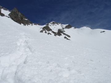 | 白出のコルへ登る途中から見た直登ルンゼ | 白出沢滑降開始♪ |