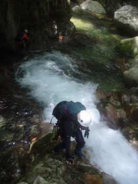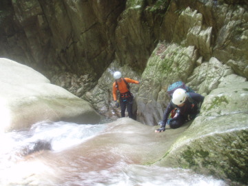 | 高巻き中から見たトユ状15m滝 | 巻きが多いので遊べるところでは積極的に遊ぶ |