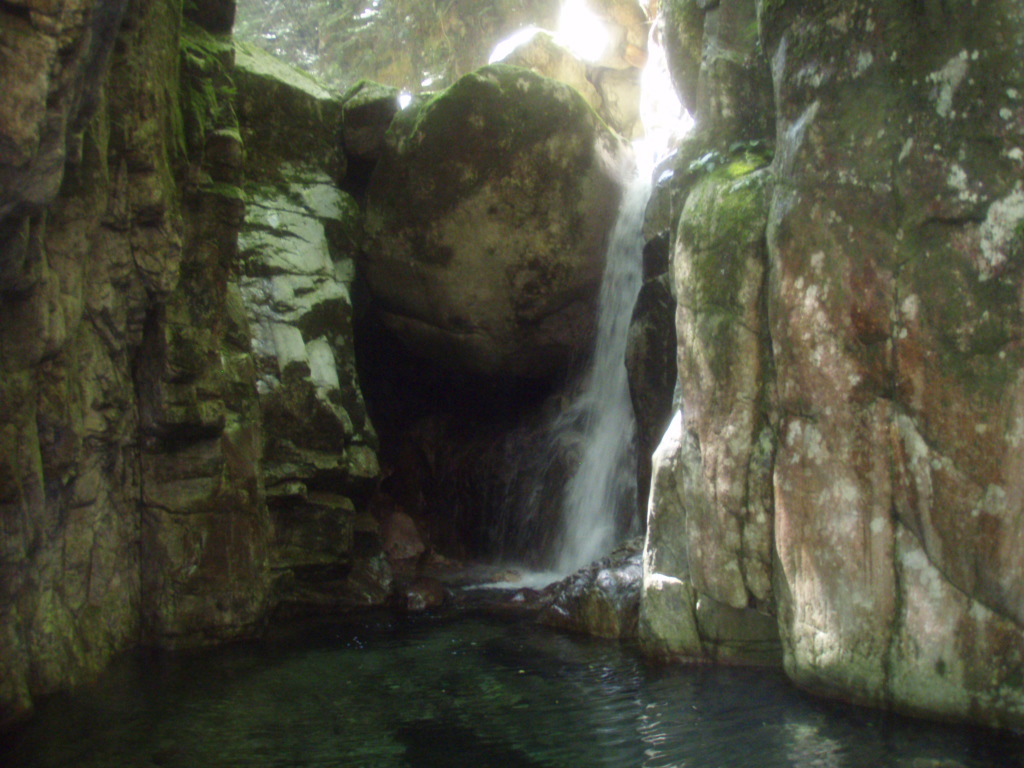 | その先はすぐにトユ状4m滝で快適にシャワークライミング♪ 出てくる滝はほとんど登ることが出来るので楽しい。 廊下帯は続いていく。5m滝を右壁から越えるとヌルヌル4m滝。タワシがあると便利だ。 水に浸かったり気合いで乗り上がったりしながら楽しく登っていくと釜を持った2m滝と続く連瀑。 次に出てきたヌルヌル岩でうなさんは泥風呂に2回飛び込んだ。お疲れ様! 続く3m滝を越えると廊下帯から明るい河原に変わる。 開放感のある河原の先に稜線が見えているがまだまだ遠いし高い。 どんどん時間は過ぎてゆくので我々は一番釈迦ヶ岳に近いお花谷に入ることにする。 お花谷に入ると両側の壁が立ってきてあやしい感じになってくる。 すると奥に滝が見えてきた。近づくと15m滝で周りは壁に囲まれている。行き詰ったよ〜 もしかしたら左に入る急峻なルンゼのどこかに抜け道があるかもしれないがすでに時間はぎりぎりいっぱい。 ここは一番安全な来た道を戻ることを選択する。 そうと決まれば、さっさと引き返しはじめる。暗闇に退路を断たれる前に戻らないと。 飛び込めるところはみんな飛び込んで歓声をあげてる。 高いところはさすがに2の足を踏むが鎌ちゃんや牧野さんは慣れてはるのでどんどん飛んでいく。 CS6m滝は右岸から巻いて懸垂下降で川床に降り立つ。 すぐに旭ノ川本谷との出合。単調な河原を急ぐ。2段滝を右岸から巻くころはだいぶ薄暗くなってきた。 南谷出合を過ぎて左岸の林道へあがる踏み跡までたどり着くとやっと安心。 あとは暗闇になろうがすでに着いたも同然。やはり林道を歩いてるうちに日没するが無事に駐車地に到着。 下山予定地のデポ車を回収して温泉に向かうが残念ながら営業時間は過ぎてしまっていた。残念。 ウォーミングアップのつもりが中身が濃すぎたので翌日は全身筋肉痛でした。 でもとても楽しい沢登りができました♪同行のみなさま楽しい1日をありがとうございました! |