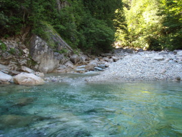 | かっきーの帰省Uターンに合わせて沢に行くことになった。場所は前々から行ってみたかった金木戸川支谷の小倉谷だ。 写真で見るとなかなかの美渓なのと詰めが未だ登ったことのない笠ヶ岳ってのも魅力的♪ 前日の晩かっきーと合流しクルマ2台で新穂高温泉に向かう。 ピークが過ぎたとは言えまだまだお盆休み後半、新穂高温泉の駐車場はほぼ満車状態だった。 ここに1台デポし、もう1台で金木戸川を目指す。 双六ダムの脇を抜けるとすぐに第一ゲート。閉まってることも多いというこのゲートはラッキーなことに開いていた☆ これで1時間貯金できた!うわい♪ 未舗装ながら走りやすい林道をどんどん奥に走っていくと第二ゲートにぶちあたった。 早速準備して出発。ゲートの鉄柵を乗り越えて歩き出す。 一応2泊の準備をしてきたが、天気予報では3日目が雨天なので2日間で抜けてしまおうと企む。 山友達のけもけも氏が「小倉谷は1泊で楽勝にゃん♪」と言ってたのでそれを信じよう。 今シーズン初の沢泊まり荷物なのでとても重く感じる。 歩き出して30分でもうバテバテ。 大丈夫かっ!? 林道をどんどん進んでいくが久々の重荷と意味なき早歩きで早速靴擦れになる(;◇;) ほんまに大丈夫なのかっ!! ヘロヘロになりながらなんとか双六発電所の取水堰堤に到着。 林道はここで終わって登山道に変わる。このあたりは広河原と呼ばれていて快適そうなテン泊適地がある。 やや荒れ気味の登山道を進んでいくとすぐに対岸に小倉谷の出合があった。 河原に降りてしばし休憩。水に浸かってクールダウン。金木戸川は澄んでいてとても気持ちがいい。 さてさて、まずは本流の渡渉。出合付近は流れがきつそうだがクールダウンがてら泳いで渡ることに。 プカプカ流されながら対岸に這い上がる。かっきーは泳ぐの嫌って50mほど下流を渡渉し左岸をへつって出合までやってきた。 小倉谷に入渓しまずは河原歩きからスタート。美しく澄んだ流れを楽しみながら歩いていく。15分ほどで最初の滝が現れた。 4m斜瀑は左からへつって滝身左壁を登る。しばらく進むと3条3m滝の奥にトユ状10m滝が見えてきた。 ここは進めないので右のガレから高巻いて簡単に滝上へに降りる。すぐに淵の先に2m滝。ここは左から巻いて越える。 その先は両岸立ってきてゴルジュっぽくなってくる。右から入る枝谷30m滝を見送ると一段と狭まりその先に2段7m滝。 左から巻いて次の4m滝は空身で滝右側の溝をキャメロット2個とアブミとスリングで乗りあがる。 そのまま左の落ち口に上がりザックを荷上げしてからかっきーがアブミ等を回収しながら上がってきた。 続いて箱状ゴルジュの先に5m滝。ここは大岩左の溝を空身ショルダーで越える。しかしザック荷上げは疲れるの〜 続いてこんどは「横からの滝」15mが登場。これは無理だわ。右から簡単に巻く。 滝上からは明るい広河原で意気揚々と進んでいく。 ・・・・が長い(^^; だんだんダレてくる。 しかし単調なゴーロは終わらない。 もうダレダレ。 結局1時間ほど歩いてお願い勘弁してってころにやっと変化の兆し。 いよいよ大ゴルジュ入口の大岩の重なった滝が見えてきた。わくわく♪ ここは水に浸かって右端から越える。その先でいよいよ両岸が立ってきた。 まずは淵を持ったCS3m滝が出てきた。 滝身左の壁が唯一の弱点らしい。 遠めに観察。 ようは離陸できるかどうかって感じなので、とりあえず行ってきま〜す!っと左壁ぎわをへつり泳いでいく。 どれどれっと探すと指がかかったので「うおりゃあ〜」と体を持ち上げると無事に離陸成功♪ 水に浸かったザックが重いがあとは壁上まで登ることが出来た☆ 続いてかっきーも問題なく上がってきた。 |