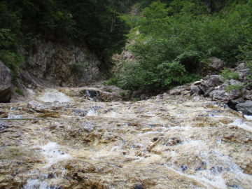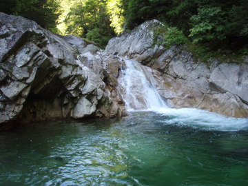 | 8/17 第2ゲート(6:10)---小倉谷出合(7:40/7:55)---トユ状10m滝(8:30)---広河原(10:15)---大ゴルジュ入口(11:15)---ナメ床40m直瀑(13:30)---6m滝上テン場(14:25) |