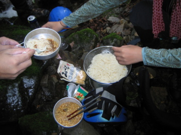 | 小滝が連続したと思うのだがこのあたりの記憶はとても曖昧^-^; なんせ出てきた滝はどんどん登ったような・・・ 僕は最後尾を歩いているのだが、先頭を歩くたかやんがどんどん突っ込むのでしかたがない。 まったり沢登りどころではない^-^; まっちゃんもそれに続いてガンガン行ってるし・・・ 攻撃系のツートップだ。。 泳いで取り付く斜瀑を越えると15m滝にぶちあたった。 これはさすがに登れないので巻くことに。 両側から高巻きできそうなので、しばし談義。 結局たかやんとこてっちゃんは左岸から、まっちゃんと僕は右岸から巻くことに。 結果的には右岸からの方が傾斜は急だが小さく巻けたようだ。 続く斜瀑20mを水流左手から登りきると谷が開ける。 ここでこてっちゃんはいつものように膝を打ちテンションダウン^-^; 膝サポーターをお奨めします。。 少し単調なゴーロを進むと再び滝群が出てくる。 ここもやはり快適に直登できる。 次の5m滝のシャワークライムは微妙にバランスが難しく何度かバックドロップで釜に落ちる^-^; テンションダウンのこてっちゃん以外の3人で順番にチャレンジ。 僕とまっちゃんは5回目くらいのチャレンジでなんとか登りきれた♪ たかやんはリーチの差で無念の巻きに・・・ つづく滝群も直登で越えていくと右手に壊れた植林小屋。その少し先で二俣に出る。 ここは右手の本谷に入った。 その後も直登できる滝が次から次へと出てくる。 もういいかげん飽きてきた^-^; すると3段50m滝が登場。 このあたりまでくると早くお昼ご飯が食べたくなってる。 巻いた方が早そうなので左岸を巻き上がると杣道に出た。 適当なところから沢床に戻り、本日の遡行は終了。 さっそくお昼の準備♪ 今日は冷やしそうめん。 なかなかおいしい逸品でした^-^ 帰りは左岸についてる杣道を帰るのだが一部道が不明瞭になってた。 ところどころで道を外すが植林小屋まではだいたい沢沿いの道なので迷うことはない。 植林小屋まで戻り、そこからは山腹を巻いていくように尾根に出る。 尾根に出たとたん夏の太陽が照り付けて暑い暑い(><) ここからの下りが一番キツかった^-^; 尾根に付けられたモノレールの軌道に沿って急斜面を降りていくと朝に通った吊橋のところに降り立った。 あとは、再び吊橋を渡りクルマに戻るだけだ。 小黒谷は小粒ながらなかなか楽しい場所でした。 みなさんの記録通り出てくる滝はほとんど直登できて面白かったです^-^ |