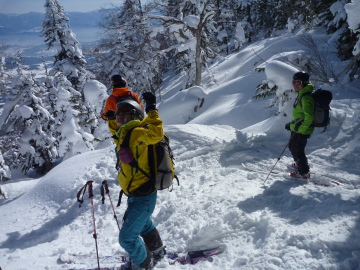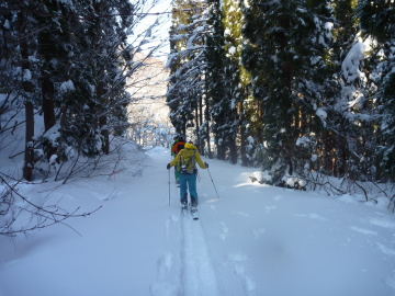 | 昨シーズンはムスメの受験のためゲン担ぎで滑り物は自粛してましたが今年はそんな必要はありません。 がんがんとまで行けませんがそこそこ滑りに行きたいものです。 そんなわけでどうちゃんのお誘いで久しぶりの黒姫山です。 前日は残業で自宅を出れたのは夜中の1時過ぎですが朝の6時前には黒姫スノーパークに到着しました。 埼玉から信州は近くて助かります。東京転勤の一番の恩恵はアプローチの向上ですな。 さて、スキー場でどうちゃんチームと合流し今回初対面のこうちゃんも到着して全員集合です。 こうちゃんは長野市にお住まいで黒姫まで1時間くらいで来れたらしいです。うらやましいですわ〜 出発準備をしてまずはゲレンデTOPまで移動。1回券2枚と引き換えの他力本願です。 すでに何パーティかは出発してはります。我々もさっさと準備して歩き出しました。 ゲレンデ跡をどんどん登っていくと旧ゲレンデトップに到着。お天気は予報と違い快晴です。展望最高! ここからは樹林帯の登りになります。途中で休憩を1回とり、2ピッチで外輪山へ。 クラストした外輪山を南に移動します。今回は東登山道のある尾根を滑り降りる計画です。 ドロップポイントでシールを剥がして滑降準備。ランチを食べてからいよいよ今年の一本目です。 順番に滑り降りていきます。雪は気持ちの良いパウダー。底着きはありますが上出来です。 途中間違って支尾根に入りかけましたがすぐに修正。 今回は僕以外はみなテレマークです。おまけにぶっといロッカー板。見てるとほんとに気持ちよさそうですわ。 僕もぶっといの欲しくなりますがしばらく物欲はお預けですわ。 標高を下げると湿った重いパウダーに変わりました。おまけに藪も濃くなってきました。 最後は林道に飛び出て終了。この林道は違う方向に向かうので無視します。 なだらかになった地形をスキー場まで歩いて終了。今年の一本目はパウダーを堪能できました。なかなか幸先よろしいです。 |