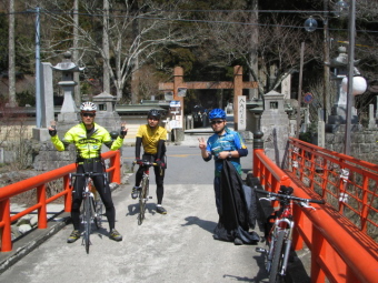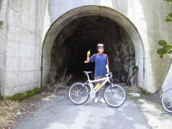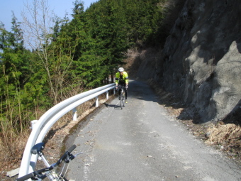 | かっきーから吉野にお花見サイクリングらららん♪に行こうとメールが入った。 花粉飛びまくりの今日この頃吉野地方は避けたいがなんとかなるかとオッケーの返事。 当日は快晴。黒滝村の道の駅に集合する。 今回初めてご一緒するとみさんを筆頭に完全にホンマもんのちゃりんこスタイルの3人。 にせもんの僕はかっきーにちゃりヘルメットをかりて顔だけホンマもん仕様に。 自転車に乗るのも正月依頼。。大丈夫かな・・・ 準備をととのえいよいよ出発!! しかしリーダーのかっきーをはじめ全員適当にしかコースを理解していない。 途中でなんども地図をとりだしてあーだこーだ・・・^-^; やっと小南峠への道を発見。道はどんどん傾斜を増していく。。 みんなそれぞれのペースで登っていく。 すぐに汗だく。素人の僕は体力まかせにただ登るのみ。。汗が目に入って開けてられないのがつらい。 ヘロヘロになるころ小南隧道に到着。この隧道は素掘りのままで路面もあやしい。 真っ黒な隧道をROADの二人はパンクが怖いので降りて通過。今度は洞川まで下るのみ。 こてっちゃんが先行でびゅんびゅん下る。ROAD組は路面がいまいちなので慎重に下る。 洞川の吊橋をくぐり龍泉寺前に出る。ここでトイレ休憩。 温泉街を通り抜けごろごろ水で水分を補給し五番関の登りへ。 今度は小南峠ほどの苦労もなく五番関のトンネルに到着。トンネルを越えてしばらく下ると吉野方面への分岐。 入り口には崩土通行止めの看板が・・・ 「まあ、いけるやろ」ってことでぐんぐん進んでいくといきなりユンボが立ちはだかる!! あちゃー・・・(><; 崩土を乗り越えてでも進みたそうなかっきーだが、ここは針路変更で決着。 来た道を洞川まで戻り、中華料理屋でランチタイム。もう峠越えはないとのことでラーメン・餃子にビールで中締め。 洞川からはROADの独壇場!! さすが早い早い。。 この頃になるとどんどん花粉症の症状が悪化。。走っていると両方の鼻の穴からジェット噴射のように鼻水が飛び散る。 2本の長いトンネルは怖いが、おおむね下りばかりで快適に走る。 しかし、トンネルの中でトラックに追い抜かされる時はチビリそうになるなあ。 トンネルを越えて最後の下り、ROAD組は猛スピードで消えていく。僕は自転車がクルマを煽る姿を初めてみたぞ!! そして、無事に道の駅に帰ってきました。。 この暖かさで朝は開いてなかった桜がきれいに咲いていた。 吉野には行けなかったがこれで満足^-^ 名物のこんにゃくを食べて解散となりました。。 |