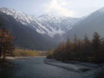 | 河童橋から見た穂高連峰 | 雪が繋がり出した |
