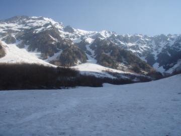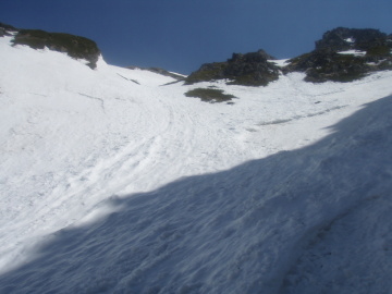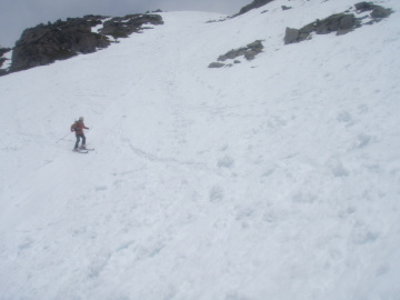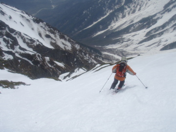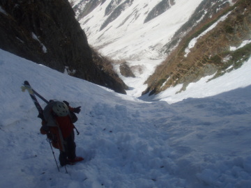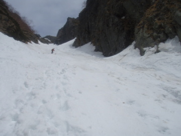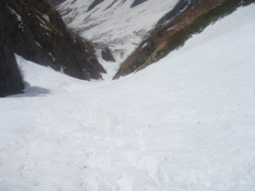| のどに向かう急斜面を滑るだるるん | 2700m付近で奥明神沢と合流 |