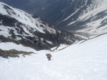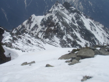 | 2700m付近で前穂高に突き上げる沢に入る | 前穂高までは緩んだ雪と格闘 |