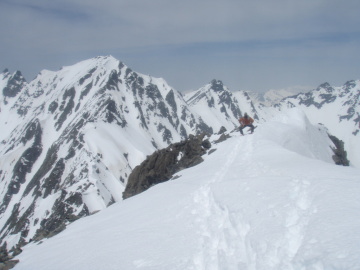 | 前穂高岳山頂で記念撮影 | てっぺんから滑りだしの斜面 |
