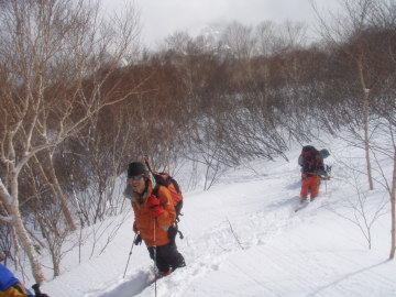 | 前山のてっぺんで集合写真 | 滝沢尾根の滑り出しは藪だった |