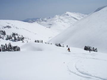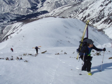 | てっぺんに全員そろってからいよいよ滑降開始。まずはD氏が先陣で滑り降りる。 続いてぞろぞろと12名が続く。先日の雪が影響して雪質は悪い。滑りにくい雪が続く。 私の細板では技術不足でコントロールできない(>◇<) 少し滑り降りたところで井戸尾根チームと米子沢チームに分かれて降りることにする。 私はせっかくなので米子沢チーム(にゅオキ、けも、HAIDI、にゅきむ、一休、あう)に入った。 まずは米子沢に向けて滑り降りる。このあたりまだマシ。谷に降りるといやな雪庇が気になる。どんどん進もう。 中間部あたりになるといよいよデブリが谷を埋めだした。サイドをトラバースして進む。気温もあがり汗だくでデブリを超える。 途中の安全地帯でしばし休憩。井戸尾根を楽しそうに滑る人影が見える(>◇<) いつの間にか大滝は通過していたようだ。埋まっていてどこかさっぱりわからんかった。 さて、でぶでぶ帯の後半。相変わらずトラバースが続くが、そのうち谷が開けてきて米子沢滑降も終了。 下半分はほぼでぶっていたことになる。堰堤を左岸から越えて桜坂駐車場に戻る。 ここからは林道をひとすべりで清水集落へ。クルマに戻り、ひなたぼっこをしながら井戸尾根チームを待つ。 念願の巻機山を滑ることができました。雪質はいまいちでしたが大満足な1日でした。みなさまありがとう。 |