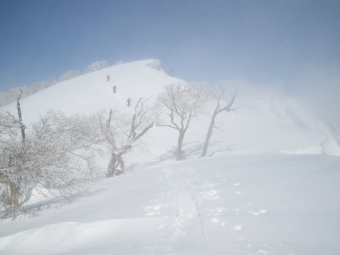 | 疎林の中をだらだら登る | 開けた斜面になると稜線は近い |