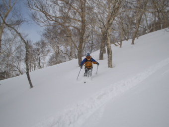 | 歩き出して1時間かからず。標高差にして450m弱くらいか。 このコースの美味しい所以は、これだけの登りで1100mくらいの滑降を楽しめるところ。 まだ時間も早いので三田原山の山頂でも行くかってことで歩き出すが、 風が強く寒いので手前の2347mピークまで行って引き返してきた。 再び2300mピークとの鞍部までもどってランチタイム。 人気コースだけあってあとからあとから登ってくる。しかし連休という事もあり大半は火打方面に足を伸ばすようだ。 さてさて、いよいよ滑降タイム♪ 地形図を睨んで滑る方向を定める。 視界が開けてきたので目標の池ノ峰方面を同定。滑るべき尾根を決めてスタート。 最初はカリカリのクラストを滑りおりるがすぐにパフパフパウダーに変化♪ 今シーズンサイコーの雪質にであえたっ!!ウヒャーっと雄叫びながら滑る。 かっきーも大喜び!! 喜びすぎて顔面からパウダーにつっこんで前転してるぞ〜(^^; ぐんぐん高度を下げていくと徐々に木の密度が増えてきた。 標高も1600mくらいになると雪質も重くなってきてヒーヒー言いながらの滑降に変わる。 尾根の末端近くで左手の急斜面に逃げて開けた台地に降り立つ。 ここからは緩やかな傾斜でスキーが進まない。 ヘロヘロになりながら漕いでいく。林道に出るとトレースがあり手漕ぎから解放。。 スキー場まであっというまだ。第二高速リフト乗り場付近に飛び出る。いったんゲレンデを滑り降りる。 駐車場に戻るには杉ノ原ロマンスリフトに乗らないといけない。300円なり(T◇T) このコースとても楽しく気に入りました。 さすが人気コースのことだけはありますね。 なんてったって登りがラクだ(^◇^) さてさて、今回の前哨戦も終了。 近くの「苗名の湯」で汗をながして、いよいよメインの焼山・北面台地を目指し糸魚川に移動です。 |