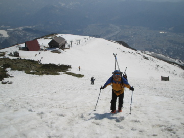 | 他力本願2日目はゴンドラ「アダム」利用で八方尾根の北面にある無名沢を滑る。 前日「金山沢」を滑降し二股で車中泊していた。 稜線から吹き降ろしてきた突風でクルマが大きく揺れ目を覚ます。 今日は風が強い。ゴンドラの運行が気に懸かるところだが。 ゴンドラ乗り場に移動すると案の定強風で運行を中止しているじゃないですか。 他力本願他力本願・・・ とお祈りをしながらキップ売り場で並んでいると10分おくれでゴンドラの営業を開始。 願いは通じた!! ゴンドラ終点からリフトを2本乗り継ぎ八方池山荘に到着。稜線上は雪が切れている場所が多くスキーは担ぐことにした。 八方山ケルン、第二ケルン、第三ケルンと順調に通過。 景色もすばらしい!! 昨日滑った金山沢の大斜面も見えている。 雪で埋まった八方池を過ぎると右下に目的の無名沢が見えてきた。 「滑り出しはどこがいいかなあ〜」と見渡すと行く手に見える2361mピークが我々を誘っている。 ときおり吹く強風に耐えながら進んでいく。 この頃から雲が増えてきて気温も徐々に下がってきたようだ。 気温の低下や上昇が思わぬ悪雪を生む事を学習した我々は滑り出しを11時と設定し全員に伝達。 「11時になったら2361mピークに到達していなくても無名沢に飛び込むように!! 諸君また会おう! チャオ」 |