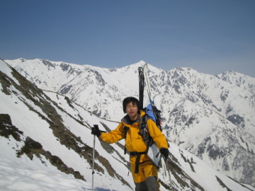| 小蓮華山と昨日滑った金山沢の大斜面 | 白馬三山をバックにご機嫌よっしぃー |
