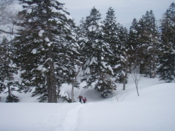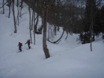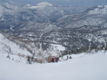 | 4月に入り、そろそろ山スキーも終盤戦に突入。行けるときにはいっとかないと。 この土曜日はどうやら天気は西から下り坂。ならばなるべく東にむかおうと苗場山を計画。 先日タクさんが「苗場山にするかもっ」てメールがあったので聞いてみると同行することになった。 久しぶりにMINMINさんも合流とのこと。 さてさて、当日早朝に津南町役場で待ち合わせ。秋山郷を目指す。 信州の秘境、秋山郷はさすがに大阪からは遠い。結局、一睡も出来なかった。 小赤沢川の左岸林道をクルマで登って行くとちょうど1合目で除雪終了していた。 ここで出発準備。まずは林道を歩いて行く。昨日のものだろうかスノーシューの踏み跡が続いている。 2合目を過ぎると小赤沢川に架かる大ゼンノ滝が見える。その少し先で林道を離れ登山道沿いを進む。 まずは谷状の地形を登って行く。左の小ピークをぐるっとまくように進むと小赤沢川の右俣に出合う。 右岸に渡るのだがかろうじて繋がっているスノーブリッジがひとつあった。 対岸の斜面を急登し尾根にあがると広い台地状になっている。 樹林の台地を東へ東へと登って行く。数日前に降った雪が重い。 今日は雪質に期待はしないほうがよさそう。春山用のスキー板できたのだがあきらかに選択ミスだ。 ときおりあらわれる急斜面に苦労しながらも順調に高度を上げていく。 振り返ると鳥甲山が美しいシルエットを見せいている。 標高1700mの手前あたりで時間切れなのかスノーシューのトレースが引き返していた。 僕達もこのトレースがなければ頂上まで届かなかっただろう。感謝。 さてここからラッセル開始。湿った重い雪は細板ではなかなかつらい。 それでもまだ傾斜は緩いので1700m地点までは問題なく到達。目の前にはぐるっと苗場山頂上台地の壁に囲まれている。 ダイレクトに頂上を目指すと近そうだがMINMINさんのリクエストで登山道沿いを登ることにする。 ここからは傾斜がいきなり増す。とたんにペースが落ちる。 頼みのタクさんはシールに雪がびっしりはりついてラッセルどころではなさそうだ。 しかたがないので一人で頑張る。斜面をトラバース気味に頂上台地2036mとの鞍部を目指して登っていく。 |