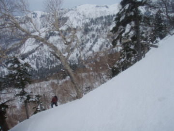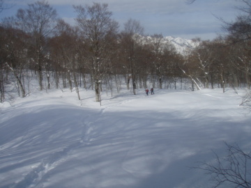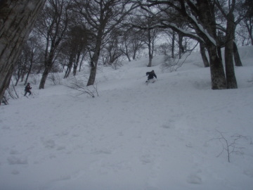 | MINMINさんは故障明けなので慎重 | 激重急斜面を楽しむタク氏 |