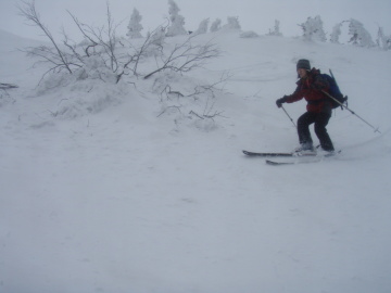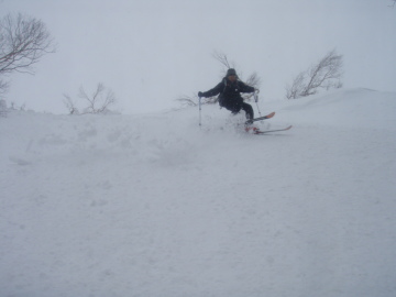 | 頂上台地を滑る | 激重湿雪でもアグレッシブなタク氏 |