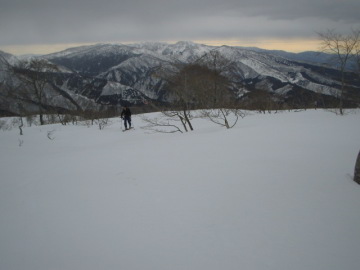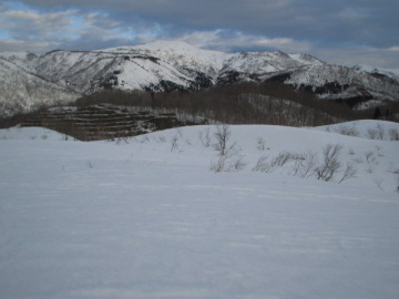 | 日岸山のてっぺんから見た願教寺山 | 日岸山南面を滑るobaさん |