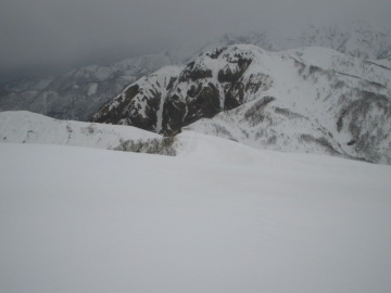| obaさんのお誘いで石徹白の薙刀山と日岸山に行くことになった。 薙刀山は以前和田山牧場跡から見た姿が印象的でいつか登ってみたいと思っていた。 日岸山は薙刀山のもうひとつ北側にあってこちらもスキー向きの山らしい♪ 今日はロングコースなので白山中居神社を6時すぎに出発。 和田山牧場跡までの林道はところどころ雪がきれている。やはり今年の雪の減り具合は1ヶ月は早い感じ。 和田山牧場跡まではスキーを担いで林道を忠実に歩いて行く。 途中でシール歩行に切り替えてショートカットしていったmatumuraさんの方が牧場跡に早くついていたようだ。 天気予報はいまいちだったが高曇りなので石徹白の山々が見渡せる。 目指す薙刀山がまだまだ遠くに見える。先を急ごう。 和田山牧場跡を横切って野伏ヶ岳の北東尾根を巻くように進むと推高谷右岸沿いを行くようになる。 適当なところで推高谷を横断し薙刀山への斜面に取り付く。 ひと登りするとだだっ広い雪原に飛び出た。 ここが薙刀平らしい。テントが一張り張ってあった。 薙刀平から広い斜面を登りきると薙刀山(1647.2m)の頂上に到着。 頂上からは360度の大展望。奥越や白山方面が見渡せる。 ではでは本日の1本目! シールをはがして北側の鞍部に滑り降りる♪ ・・・と思ったのだが 最初の1ターン目でこける(>◇<)??? うぉぉ〜 おもいっきりモナカじゃん(;◇;) 50mくらい滑ったところですでに帰りたくなる。 それでも「今日はピークハントだ!」と割り切って半泣きになりながら鞍部まで滑り降りる。 |