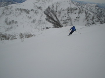 | 薙刀山から薙刀平と和田山牧場跡を見下ろす | 薙刀山東面を滑るmatumuraさん |