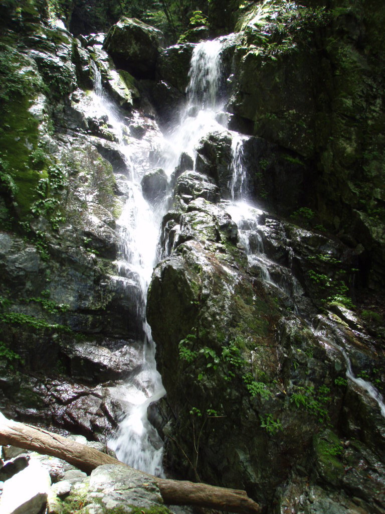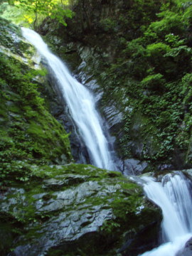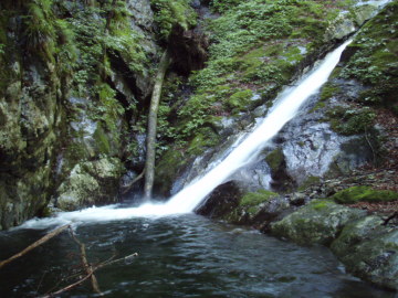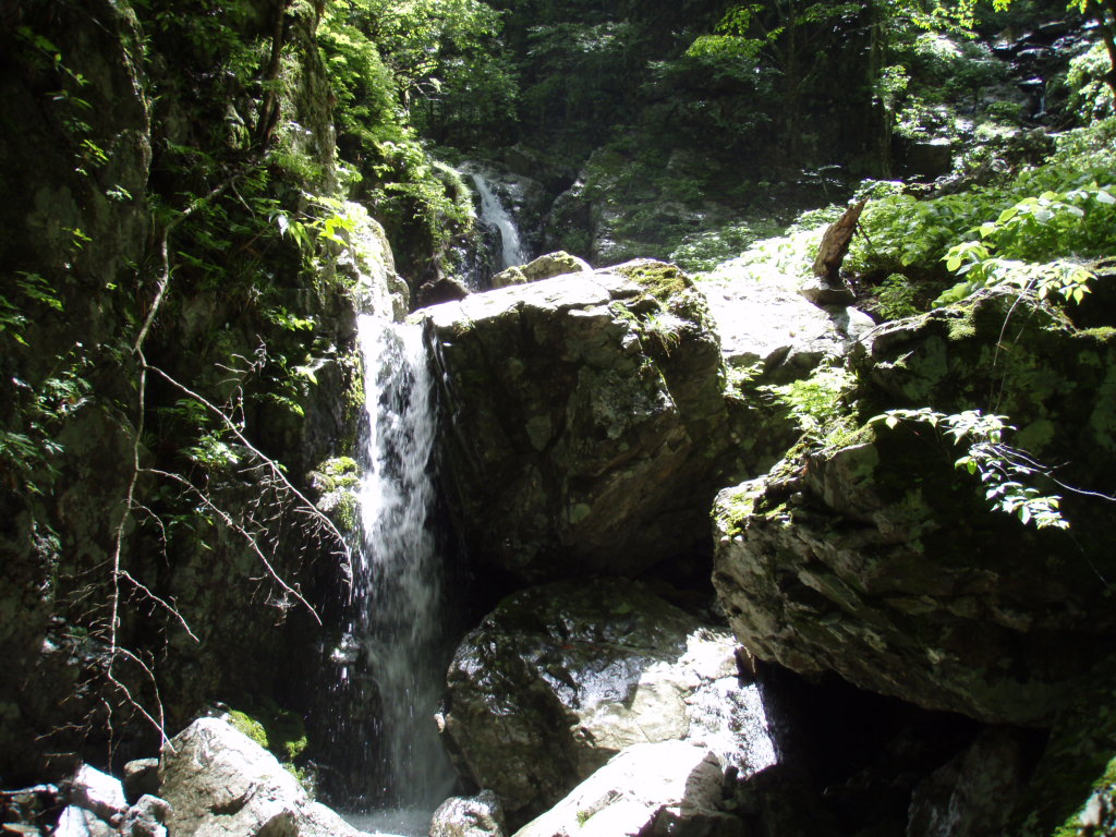 | 今回は久しぶりに大峰の谷に向かった。前日から降り続いていた雨は出発地の入谷出合に着く頃には上がったようだ。 林道ゲート前の空きスペースに車を止めて舟ノ川をのぞいてみる。 用事で参加出来なかったまっちゃんの「濁流で入渓できなかったらいいのに。いひひひ・・」との捨て台詞とは裏腹にとても穏やか。 遡行には全く問題なし。さっそく準備をして歩き出す。 入谷林道のゲートを横からすり抜け長い林道歩きが始まる。 雨上がりで湿度が高く気温も高いのですぐに汗まみれ(>◇<) 入渓前にヘロヘロ状態だ。あづいあづい〜 林道は入谷の右岸沿いにつけれられているが目的のナメラ谷は左岸の大支流だ。見落とさないように地形図を見ながら慎重に歩く。 なんとなくそれらしい谷が見えてきたので踏み跡をたどって入谷の河原に降り立つとすぐにナメラ谷の出合があった。 ナメラ谷に入ると流れは右にカーブをし、すぐ先で左に曲がったところから両岸狭まり奥にトユ状3段15m滝が落ちている。 これは手が出ないので左岸を巻きあがる。 いきなりの急斜面の登りだ。 ひーひー言いながら登る。 滝上から流れに戻るとゴルジュ状で2mくらいの小滝が架かる。よいしょと乗り越えて進むがこの谷はどうもヌルヌルしていて気を使う。 その先は左手に大岩がある2条7m滝。ここは滝身の右を直登する。続いて釜を持った10m斜瀑が右から入る。美しい滝だ。 右手を小巻きで滝上に上がる。その先で谷は開けてくるが流れがインゼルになるあたりでなんと林道が横切った。 なんとなく興ざめな気分になるが林道の恩恵も多大に受けてるので文句は言えないか・・ 林道を乗り越してしばらくは平凡な渓相。右手から滝をもった枝谷が入る。岩間6m滝を越えて左に杣道の壊れた木橋を見送ると2m滝。 それを越えると左から10m滝を落ちている。どうやらこの先から核心の大ゴルジュがはじまるらしい。 |