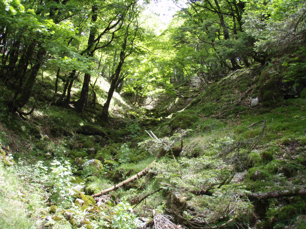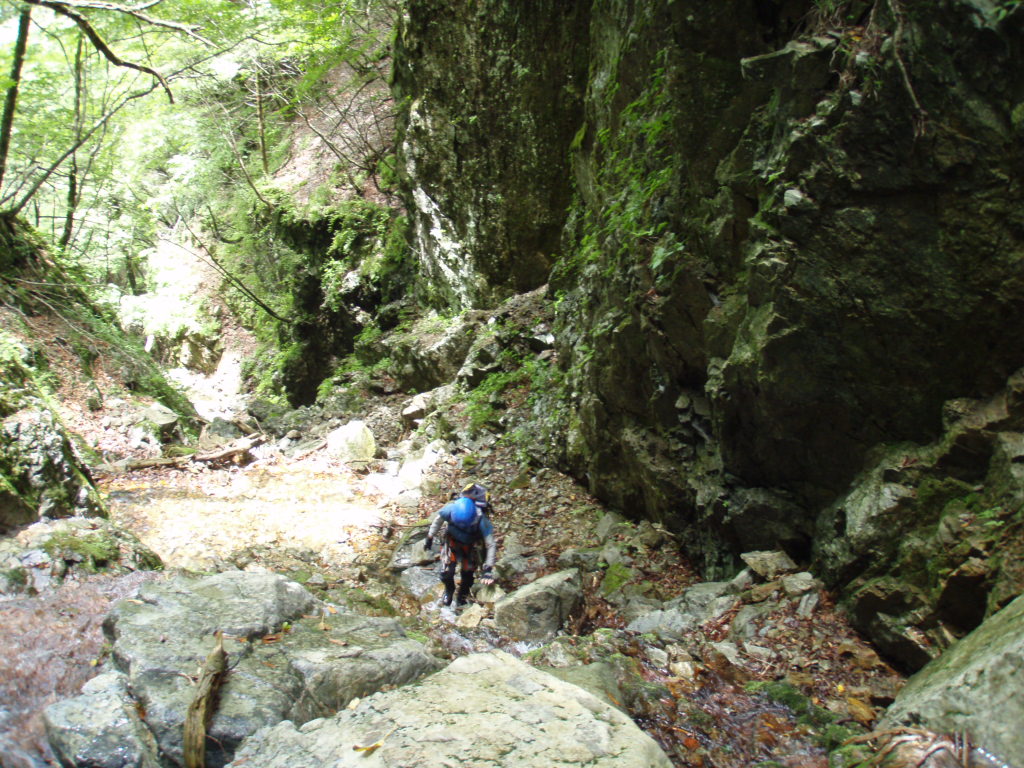 | で、10m滝は全く手が出ないので左岸を巻くことにした。 小尾根を登っていると10m滝の上には連瀑が続いているのが見えた。おお〜すごいすごい(・◇・) その先は両岸狭まっているがここからは中が覗けない。 どんどん追い上げられてしまう。 トラバースに移るが壁が続いてなかなか川床に戻れない。 雨上がりでなのか泥壁がづるづる滑りとてもいやらしい。 壁が切れたところでようやく水辺に戻れると思ったらその先にまたまた10m滝が架かる。 またまた高巻き開始。 ヒーヒー言いながら巻きまくる(>◇<) 今回もなかなか谷に戻ることが出来ない。 高巻きもなかなか渋い。 壁の上のトラバースが続きやっとのことで川床に戻ることが出来たのは巻き始めてから1時間くらいたってからだった。 すぐに水に浸かってクールダウン。冷たくて気持ちいい〜 そこから谷はゴーロ状になりいったん伏流になる。しばらくは水が出たり無くなったりしながらゴーロが続く。 途中の河原でランチタイムにしておにぎりをかじる♪ お天気もよくてとても気持ちいい。 右岸にーが立ち始めると再び滝が続くようになる。このあたりは直登できるものも多くて快適に進む。 しかしシャワーばかり浴びると寒くなってきたので後半は巻きばかり(・◇・; CS10m滝上の8m滝は右から高巻くが壁でいきづまったので投げ縄で越える。 谷はしだいに傾斜が強くなりルンゼ状になってくる。 崩壊壁からの落石を注意しながらどんどん登る。 ルンゼ状の中にもたくさんの小滝がかかりなかなかすんなりとは進まない。 それでも徐々に源流の雰囲気になってくる。 トウヒの原生林の中を苔むした地面が覆う。 最後は頂仙岳方面から明星ヶ岳に抜ける登山道に飛び出した。 登山道を左に少し進むと川合と狼平に向かう道に分岐している。 川合方面に少し進み頂仙岳(1717.4m)のてっぺんに登ってランチタイム。頂上から北側の展望がひらけていた。 さてさてこの谷は下りがやっかいらしい。 僕たちはナメラ谷と桶側谷の間の尾根を下ることにする。 尾根はとても迷いやすい地形だがラッキーなことに青色ナイロンテープの目印が入谷林道まで続いていて迷わずに降りれた。 あとは長い林道歩きで駐車地まで戻るだけだ。 残念ながら核心部のゴルジュは高巻き中心になってしまいましたが、それでも登れる滝も多く楽しい谷でした。 それより何より往復の林道歩きが疲れました。 あう〜(>◇<) |